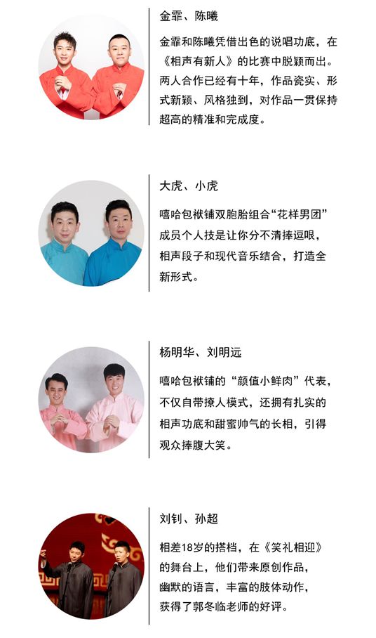 花“qian”买笑才是最幸福的事,最潮的段子诙谐幽默,脍炙人口紧贴时代脉搏,包袱永远抢鲜!说学逗唱,爆笑全场!作为中国目前最具人气的新潮相声演出团体,所到之处掌声、笑声不断,一票难求!