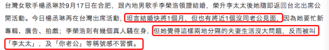原标题:刚结婚便分居?杨丞琳:一个月没见李荣浩了,对“李太太”称呼很不习