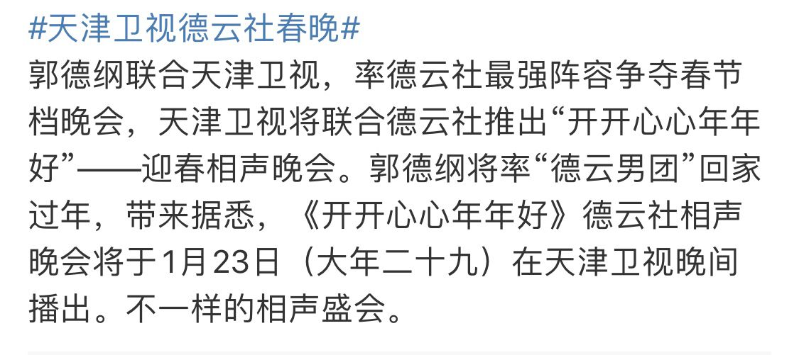 据悉,天津卫视与郭德纲德云社联手打造的这档相声春晚叫《开开心心年年好》。将在大年二十九也就是1月23日的时候播出。也就是说,再过不到一个月,大家就可以在天津卫视上看到这档相声春晚了。