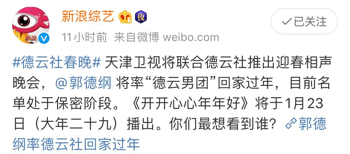 11月27日,多家媒体爆料称,天津卫视将联合德云社推出迎春相声晚会。届时,郭德纲将率领德云男团回家过年。