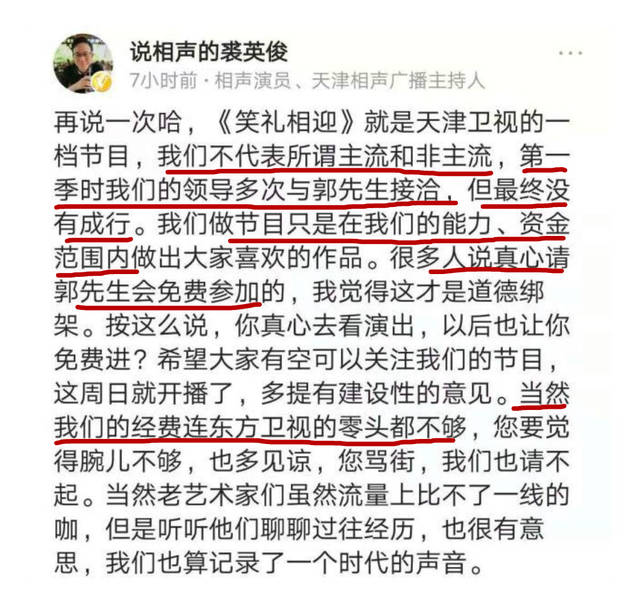 而裘英俊的这番话,也被不少网友解读成,天津卫视《笑礼相迎》请不起郭德纲。