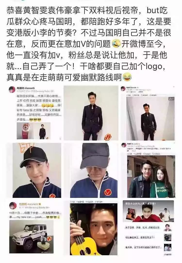 2018年无缘视帝之后反而更在意新浪微博没有给他加V,于是自己手动在照片上加V,至今马国明在微博上发的照片都是自己手动加V在发出去的。