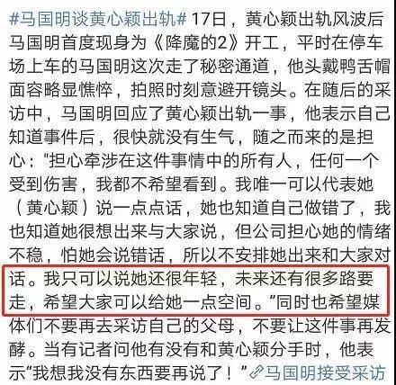 “安心”事件爆发的时候马国明在参与电视剧的拍摄工作,知道女友出轨后还是继续工作,面对记者的采访,依旧保持微笑为黄心颖说话。