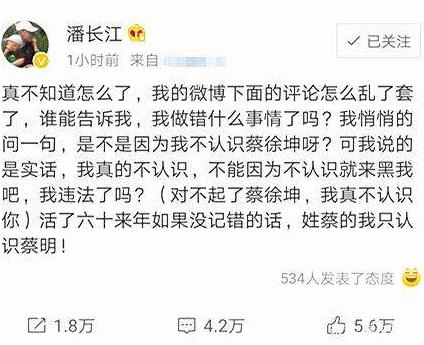 之前还发生了一件事激发了老戏骨和小鲜肉的矛盾,就是老笑星潘长江参加浙江卫视人气很旺的综艺节目《王牌对王牌》,因为临时问答游戏环节,对着蔡徐坤的照片回答他是吴亦凡,在现场闹了乌龙和笑话。不过就算潘长江不认识晚辈蔡徐坤也正常,无非就是一个游戏环节,过了就过了。