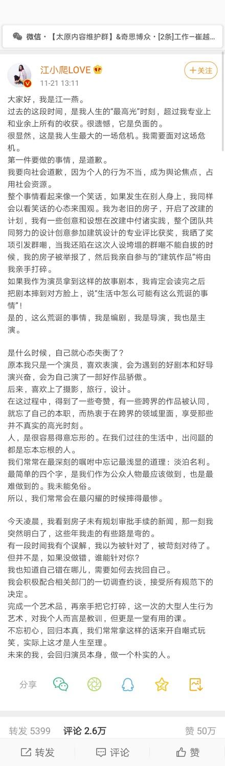 相比李小璐和半藏森林因为感情犯错被骂,江一燕流年不利的境况,多少还让人值得同情。本来这些年一直很低调的演员江一燕,通过支教等事立人设,虽然也有各种绯闻八卦,但都没实锤影响不大。没想到江一燕因为参与自己的别墅设计拿奖,在微博上晒照秀才艺,却被网友发现端倪,吐槽她沽名钓誉,人设不保。而且屋漏偏逢连夜雨,最近江一燕获设计奖的别墅被举报违规搭建,相关部门也回应了这个事实,这样一来,更是让江一燕名誉受损。经历了这段时间的洗礼,江一燕人设坍塌,从好心情巅峰跌至谷底。但还好这个不涉及感情和原则性错误,江一燕及时回应,承认错误,不狡辩,态度端正,文笔也不错。