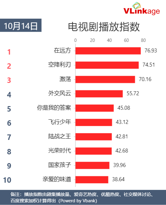 【纬岭榜单】10月14日当日#电视剧播放指数#:1.#在远方#播放指数 76.93 2.#空降利刃#3.#激荡#4.#外交风云#5.#你是我的答案#6.#飞行少年#7.#陆战之王#8.#光荣时代#9.#国家孩子#10.#亲爱的味道#