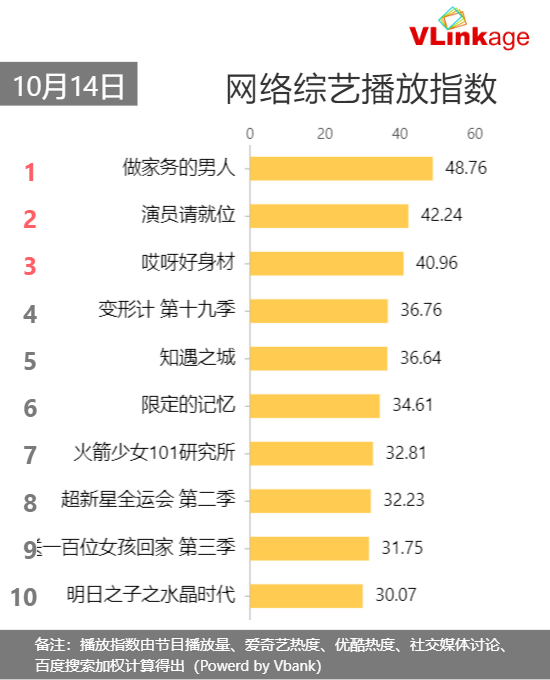 【网综榜单】10月14日当日#网络综艺播放指数#:1.#做家务的男人#播放指数 48.76 2.#演员请就位#3.#哎呀好身材#4.#变形计 第十九季#5.#知遇之城#6.#限定的记忆#7.#火箭少女101研究所#8.#超新星全运会 第二季#9.#送一百位女孩回家 第三季#10.#明日之子之水晶时代#