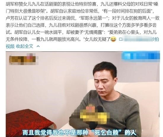胡军也是儿女双全,女儿还是老大,在接受媒体采访的时候对女儿也是各种夸!胡军称赞女儿九儿在话剧里的表现让他特别惊喜。自认儿女一碗水端平,却被妻子“无情揭露”:“爱弟弟在心里头,对九儿无条件投降、一看九儿就两眼放光高兴。”媒体也因此形容胡军:女儿奴无疑了!胡军曾经带着儿子康康上过那档亲子娱乐真人秀节目,康康表现出的那种成熟感,以及一开始俩人相处的方式,给人的感觉就是因为胡军才不得不变得成熟。