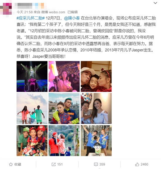 12月7日,陈小春在台北举办演唱会,现场公布应采儿怀二胎喜讯:“我有第二个孩子了,但今天刚好是三个月,是男是女我还不知道,感谢我老婆。”12月初的采访中陈小春被问到二胎,曾调皮回应“那是你说的,我没说。”其实自去年底以来频频传出应采儿怀二胎的消息,应采儿方曾在今年6月明确否认怀二胎,而陈小春在9月的采访中透露想再当爸、表示每天都在努力。据悉,陈小春应采儿2008年承认恋情,2010年结婚,2013年7月儿子Jasper出生。