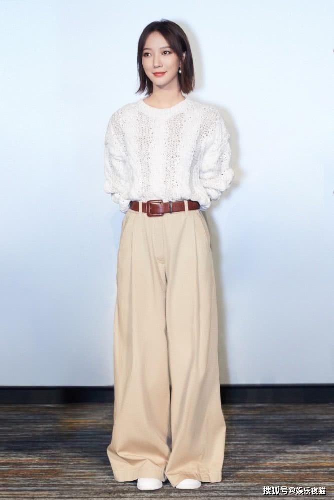 王珞丹上身穿了件白色毛衣,带有多条纹的装饰,非常显层次感,下身穿了件高腰阔腿裤,提升了腰线,裤腿垂搭在脚面上,显示出大长腿既视感,带来知性大方气质感。