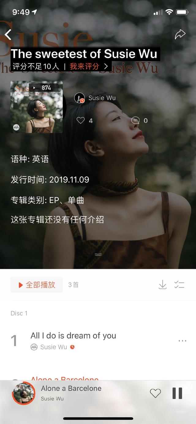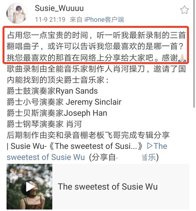 昨天,也就是11月9日,Susie不发截图了,而是直接甩出了自己唱的音乐的链接,并配文:告诉我你最喜欢哪一首?