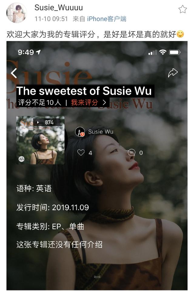 11月10日早上,Susie再次发文称:欢迎大家为我的专辑评分,是好是坏是真的就好!可见她是多么的热切地希望得到大家的关注。