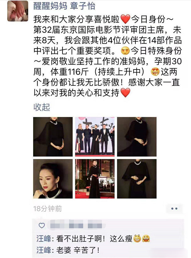 今次章子怡公开承认怀孕,第三次当爸的汪峰也兴奋留言:“看不出肚子啊!这么瘦”“老婆辛苦了”,网友们则调侃汪峰又被老婆怀孕抢了热搜。