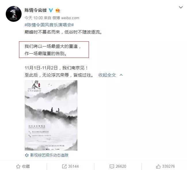 10月9日,《陈情令》国风音乐演唱会官宣,“我们将以一场最盛大的重逢,作一场最隆重的告别”,很多粉丝看完这句话都很感慨万千,《陈情令》是今年暑假播出的剧,在剧播完后热度也丝毫不减,如今是该好好跟它告别的时候了。