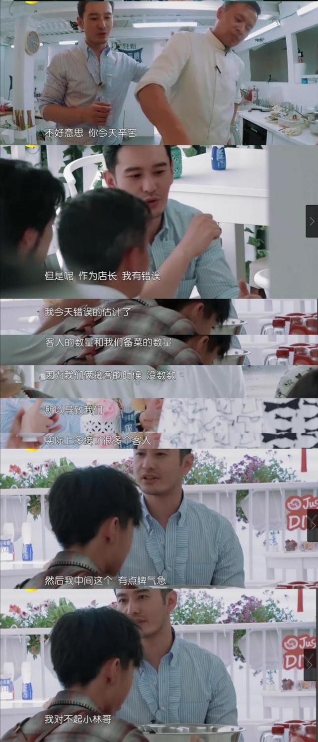 但是事实上,黄晓明这样的决定也不是不能理解,因为这一季不但零启动资金,还有很大的营业额压力,每一个人都在没日没夜的工作,非常的辛苦。黄晓明身为店长更是责任重大,他要兼顾前台与后厨的平衡,还要弥补大家可能看不到的盲区。之前经常看到网上有评论说他不干活只会下指令,这就有些无脑黑了。至少节目看到现在,除开前期的独自外出采买、打印菜单、拉客点菜、收拾桌椅、清理垃圾,到后期的借冰块、给顾客道歉、揉面包饺子、洗碗等等,该干的活还是一样没少干。