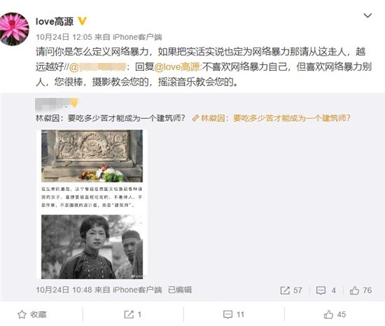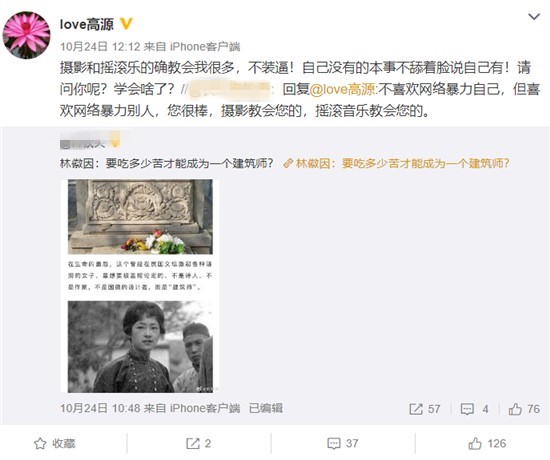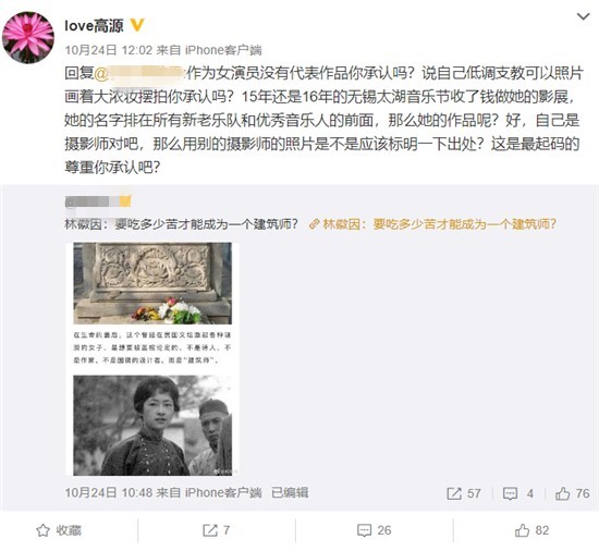 高源网上原话是:作为女演员没有代表作品你承认吗?说自己低调支教可以照片画着大浓妆摆拍你承认吗?15年还是16年的无锡太湖音乐节收了钱做她的影展,她的名字排在所有新老乐队和优秀音乐人的前面,那么她的作品呢?好,自己是摄影师对吧,那么用别的摄影师的照片是不是应该标明一下出处?这是最起码的尊重你承认吧?当有人质疑她是网络暴力的时候,高源更是没示弱直接和网友互怼:请问你是怎么定义网络暴力,如果把实话实说也定为网络暴力那请从这走人,越远越好!摄影和摇滚乐的确教会我很多,不装逼!自己没有的本事不舔着脸说自己有!请问你呢?学会啥了?