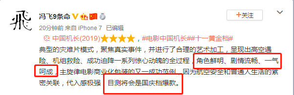 除了在超前点映票房上持续渐长,影片《中国机长》更是获得观众们一致好评如潮。甚至还有网友预测“将会是国庆档爆款。”
