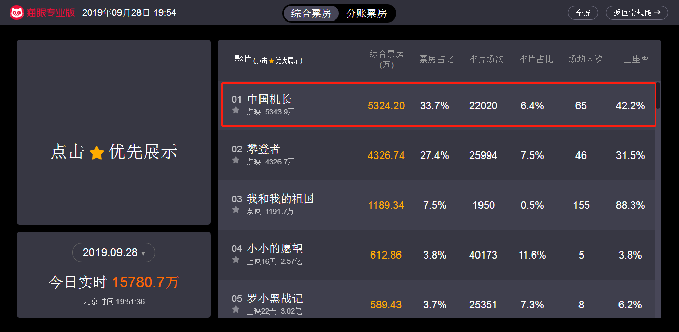 截止北京时间19时51分,根据猫眼专业版实时票房数据显示,国庆档“三杰”超前点映票房中,率先夺冠的影片《中国机长》点映票房如下:该片目前以点映票房5343.9万,综合票房5324.20万,票房占比33.7%,排片场次22020场,排片占比6.4%,场均人次65人,上座率42.2%的数据领先同档点映的《攀登者》《我和我的祖国》暂居点映票房榜榜首位置。