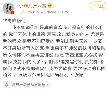 对此,张云雷也是怒不可遏,专门发文“致毒唯粉们”,怒批这些人无休止的诽谤、污蔑和攻击自己身边的人,尤其是自己的师父,让自己不能忍受。张云雷称自己走到今天,离不开身边所有人的支持,更离不开师父的扶持和帮助。