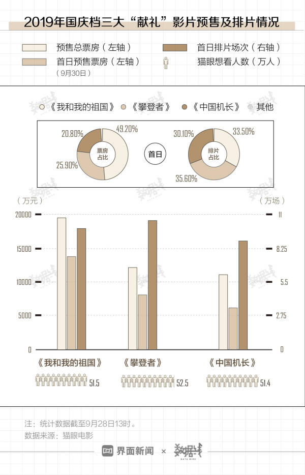 据猫眼电影数据,截至9月28日13时,《我和我的祖国》《攀登者》和《中国机长》三大献礼片预售总票房均已破亿。《我和我的祖国》以1.9亿元的成绩暂时领跑国庆档电影,该片的首日预售票房也已达1.28亿元。
