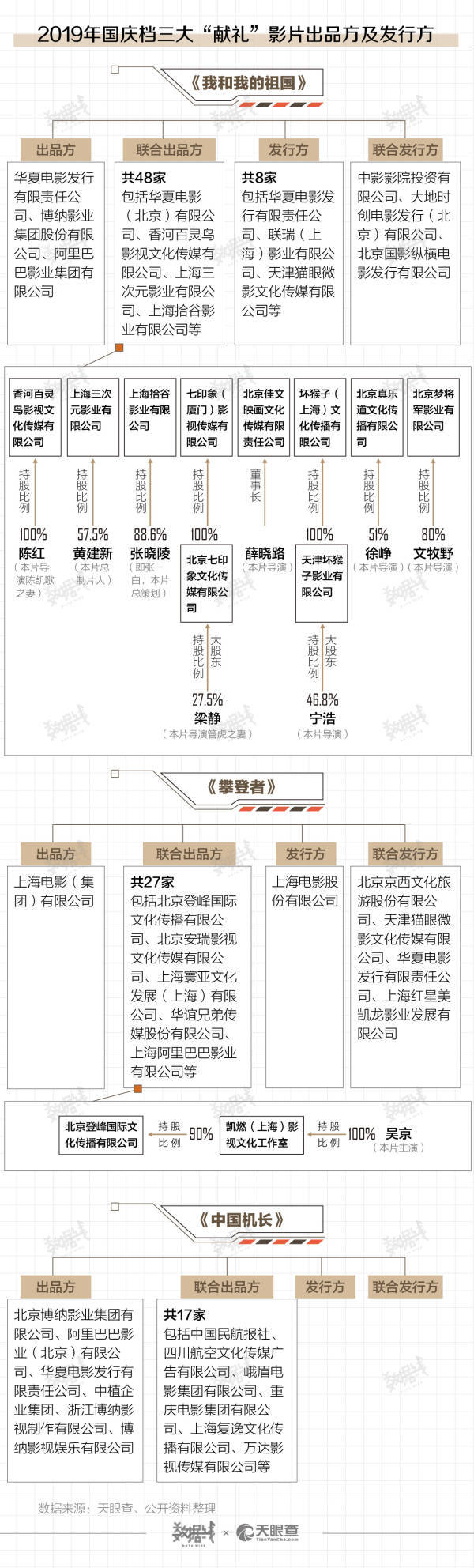 此外,天眼查数据显示,多名电影主创人员也通过个人影视公司,以联合出品的方式入局影片投资。以《我和我的祖国》为例,总策划张一白、制片人黄建新、导演陈凯歌、宁浩、徐峥等人控股的公司,均为影片的联合出品方。《攀登者》主演吴京,旗下工作室控股的文化传播公司,也是《攀登者》的联合出品方。