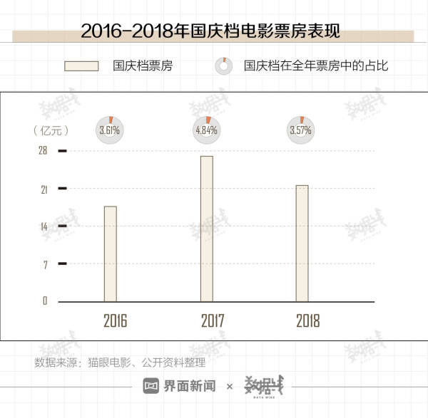 据猫眼电影数据,过去三年中,国庆档票房在17-28亿元之间,平均为22亿元,占全年票房比例在3.5%-4.9%之间。
