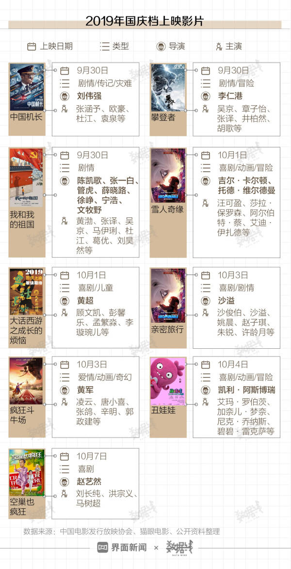 不同于前几年国庆档的是,今年国庆档适逢中华人民共和国成立70周年,国庆档将同时上映三部主旋律“献礼”电影:《我和我的祖国》《攀登者》和《中国机长》。三部电影主创阵容强大,由刘伟强、李仁港、陈凯歌、宁浩等知名导演执导,吴京、章子怡、张涵予、葛优等影星主演。