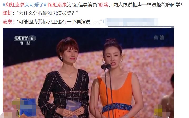 而在颁奖开始后更是趣事不断,前有邓超对孙俪比心,后面陶虹袁泉两个登台为“最佳男演员”颁奖,相互调侃自己老公更是引发现场爆笑。