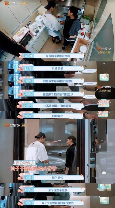 当时张亮去参与录制了芒果台的节目《新生日记》,在节目中他去姜潮家秀厨艺,姜潮顺便给老婆准备惊喜,就和张亮聊到了当初求婚的话题。张亮表示自己当初给老婆求过婚,但是比较简单,可能那个时候自己比较小,比较害羞,所以自己求婚时直接来了句:“那你愿不愿意死了之后埋在我们家坟里边?”惊得姜潮瞪大了双眼,最后张亮还是跟姜潮说:“求婚这个事儿还是需要点仪式感”。