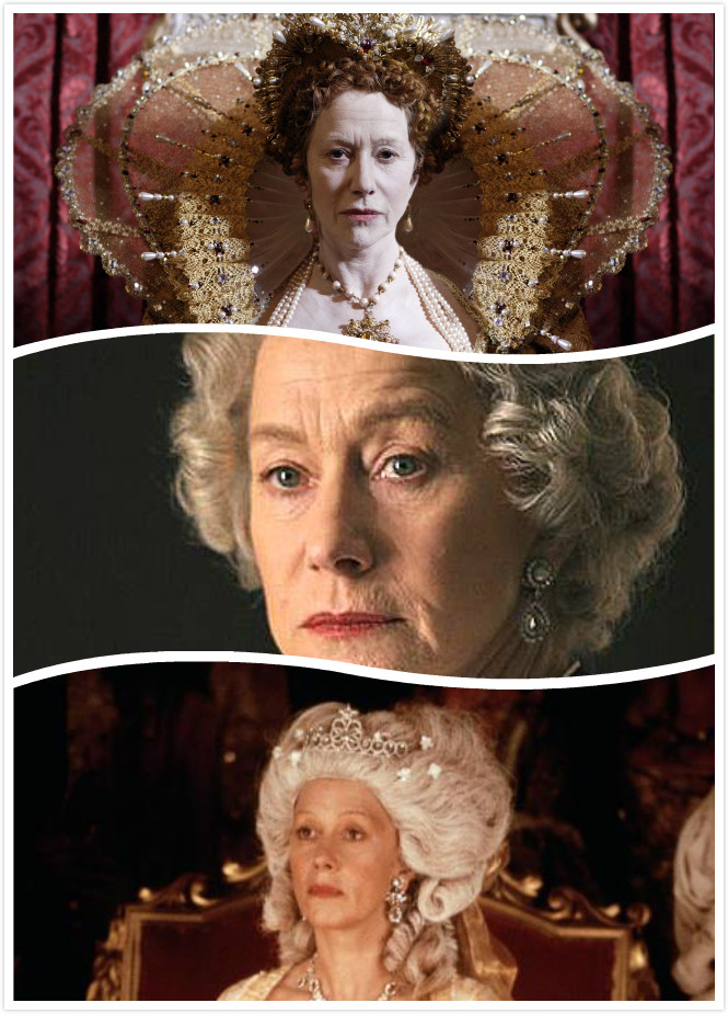 从上至下依次为海伦·米伦饰演的伊丽莎白一世、伊丽莎白二世和夏洛特王后。