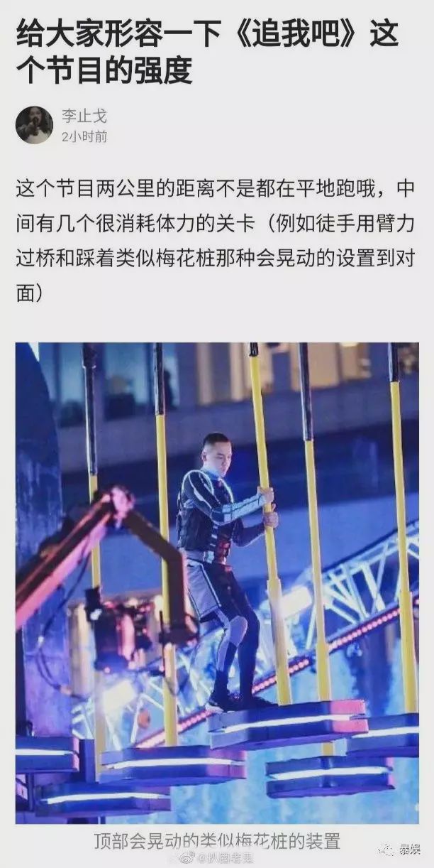 看过节目的网友肯定了解,这是一个非常拼体力的节目,还十分危险。有网友在线科普《追我吧》的运动强度,包括过梅花桩、飞檐走壁、徒手爬高楼……