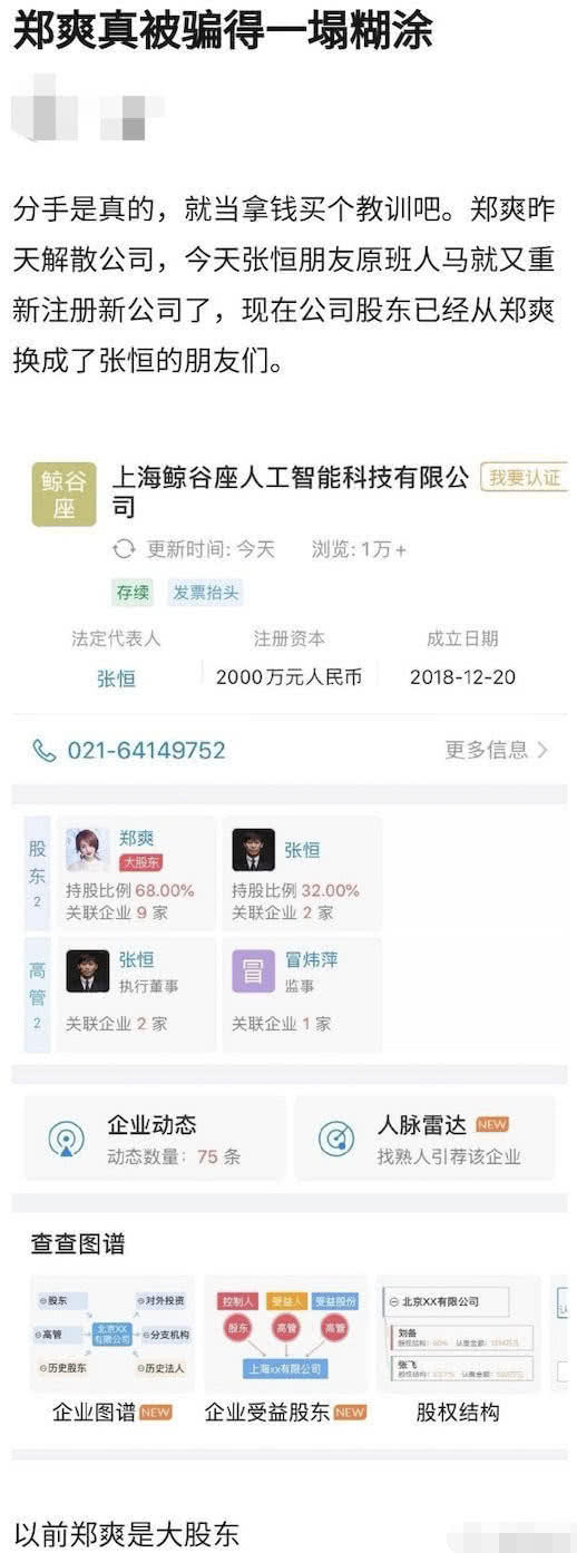 女强男弱的感情也让部分郑爽的粉丝直骂张恒软饭男,而两人共同经营的公司也被网友当成了张恒“吃软饭”的证据。在接连不断的爆料中,许多网友都为郑爽感到不值。张恒被曝拆解股份时把公司留给了自己,而且转头带着原公司的兄弟们组建了新的公司。对此,许多网友认为两人是在为宣布分手做准备。