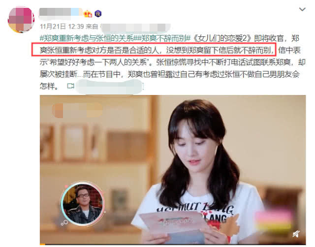 随着《女儿们的恋爱》热播,郑爽和张恒这对情侣的私下生活也通过镜头展现在网友视线中。与别的明星情侣不同的是,郑爽和张恒在网上引起热议的基本都是负面新闻。从张恒冷暴力郑爽,郑爽爱的卑微,再到最后收官时郑爽重新考虑两人关系的打算,都让广大网友对这段感情并不看好。即使在综艺播出的时候,两人分手的消息也是时常传出。