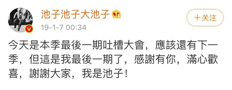 然而去年年初,第三季《吐槽大会》播完后,池子突然在凌晨发布微博,表示自己不再参与吐槽大会下一季的录制。
