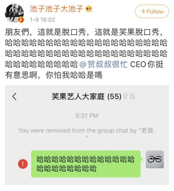 昨晚,池子晒出微博称其被移出了笑果的群聊,并火力全开抨击公司诸多不作为,甚至称“笑果成为一个成功的大型傻x公司”。