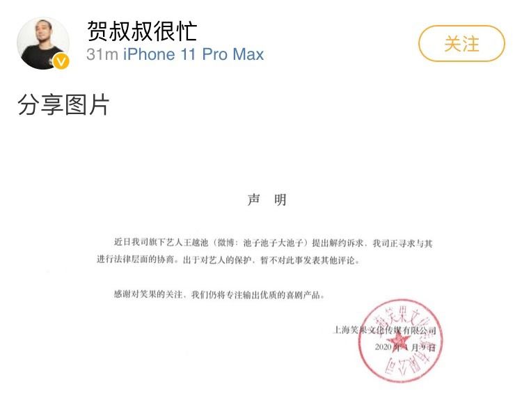 笑果文化联合创始人、CEO贺晓曦昨晚也发表了官方声明称:公司旗下艺人王越池提出解约诉求,公司正寻求与其进行法律层面的协商。