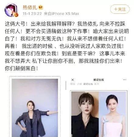 因为自曝曾患重度抑郁症而被网友广泛关注的演员热依扎,最近似乎一直生活在水深火热之中,经常由于各种原因登上微博热搜榜。11月1日晚,热依扎在微博晒出两个称其拉踩佟丽娅的账号文章,正面进行硬怼,否认自己拉踩佟丽娅。
