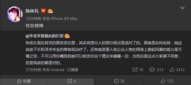 对于热依扎的行为,网友看法不一,有人觉得她是真的敢怼,被转发后删博的网友才是怂。但也有人觉得她的行为有点过了,甚至直言她应该先去治病,还疑惑她团队怎么还不把她网线拔了。