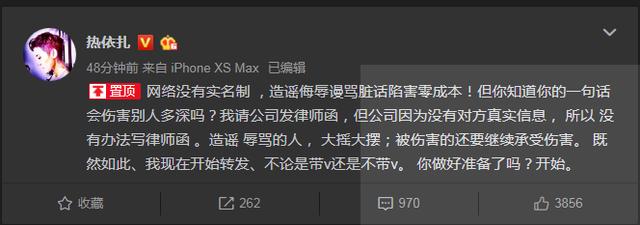 11月2日一早,热依扎再次发文,称“网络没有实名制 ,造谣侮辱谩骂脏话陷害零成本!但你知道你的一句话会伤害别人多深吗?我请公司发律师函,但公司因为没有对方真实信息, 所以没有办法写律师函 。造谣辱骂的人, 大摇大摆;被伤害的还要继续承受伤害。既然如此、我现在开始转发、不论是带v还是不带v。你做好准备了吗?开始。”并就此真的开始转发素人微博,还一转就是一个半小时……