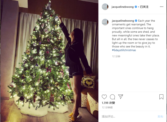 照片中黄心颖站在装饰华丽的圣诞树旁边,踮起脚往圣诞树上悬挂装饰品,短款睡裤展现出黄心颖的好身材,一双美腿十分惹眼。在拍照时,特意没开其他的灯,只有圣诞树上的彩灯发出的光芒十分美丽。照片虽美丽,但黄心颖的配文却很有深意,提到了有些东西会被取而代之,疑似在暗示自己被无线抛弃。