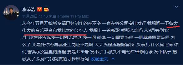 当然,不管李荣浩遇到的是不开心的事,还是遇到了不公平的事,这些都是必然会发生的事。有因必有果,早在上个月前李荣浩就给自己埋下了隐患的种子。我们都知道,歌手最迫切的就是希望能有新专辑问世,可因为新专辑制作迟迟被拖延和搪塞,李荣浩公开炮轰各大音乐平台,就连自己的经纪人都不放过,并且还放狠话不需要他们,自己也可以一人包揽将新专辑给发布出去。