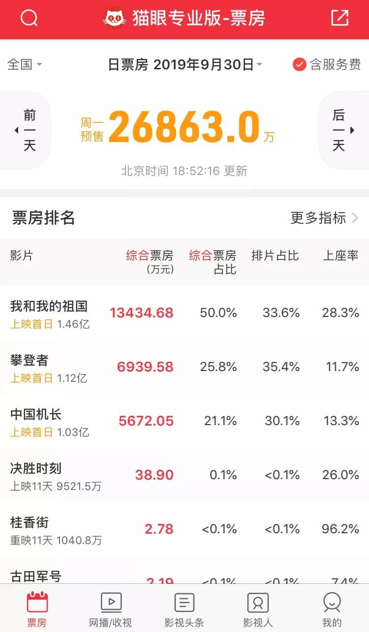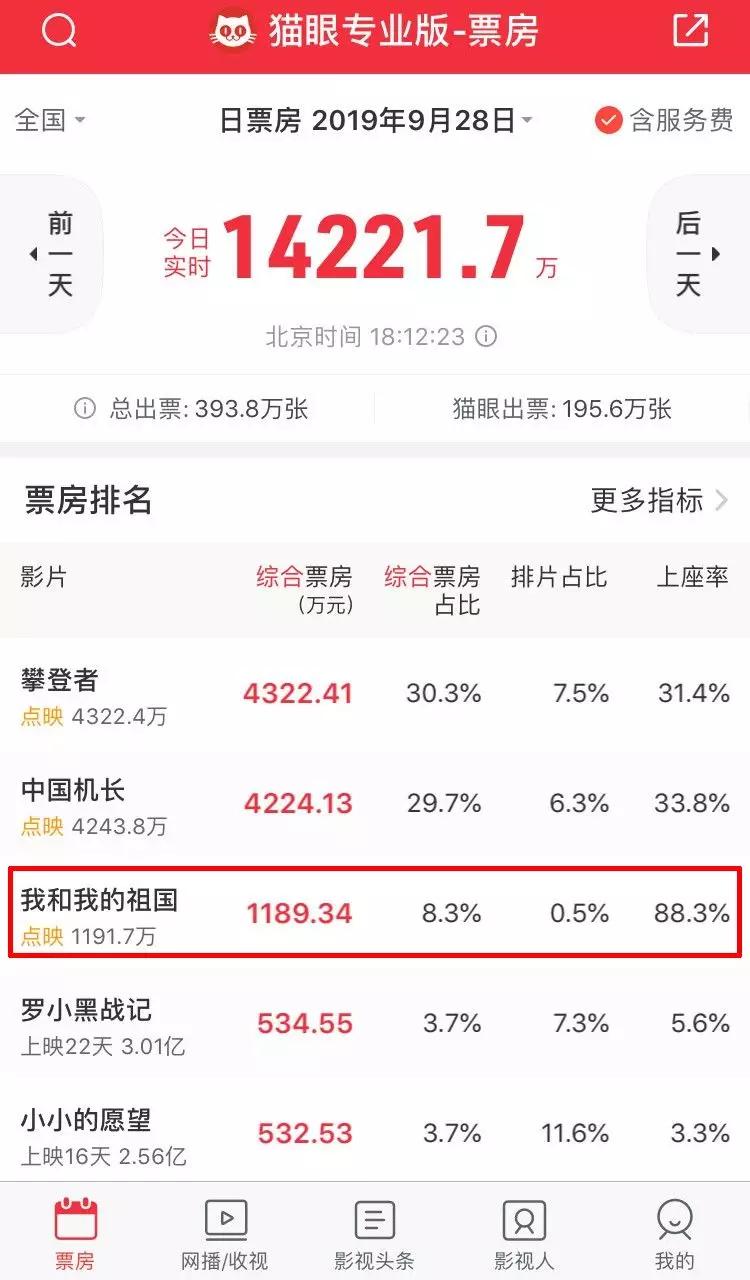 至少,从点映票房成绩来看,《我和我的祖国》有很大机会成为国庆档电影的头号种子。如果正式公映后,影片的口碑依然如此坚挺,那么其最终票房必将达到一个令人瞠目的高度。此刻,相信再后知后觉的人,如果押宝今年国庆档的票房冠军,也不会押错了。