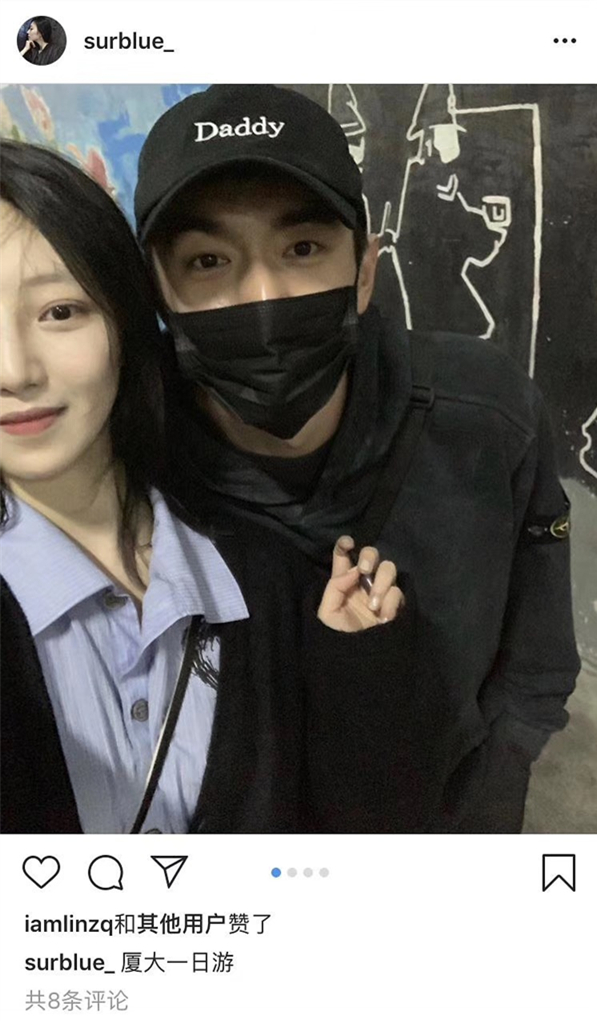 12月17日凌晨,网红SurbLue在社交平台晒出与林更新的合影,并配文称两人厦大一日游,照片中,林更新一身黑衣戴帽子口罩,包裹严实,该女生则蓝色条纹衫配针织外套,发丝凌乱,而两人在合影时头挨着头,女方还把手放在了林更新的胸口位置,两人对着镜头怼脸自拍像极了情侣,显露出了极其亲密的关系。