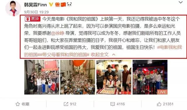 《我和我的祖国》国庆上映后,韩昊霖是彻底红了一把,能够在这么一部优秀的电影中刷脸,韩昊霖自己也非常骄傲,他在社交平台感谢了徐峥导演和所有剧组工作人员。