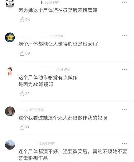 更有网友吐槽杨颖戏中尸体的姿势,看上去和马蓉此前被打后躺着的姿势非常相似,而有网友调侃杨颖这是把尸体给演活了。可见,大家对杨颖的演技依然是吐槽不止了。