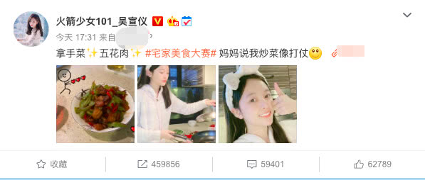2月20日,吴宣仪也在个人社交账号上晒出了自己的拿手好菜——小炒肉。菜品荤素搭配合理,卖相上乘,令人食欲大增。吴宣仪晒出了自己炒菜时的美照和自拍照。宅在家里的吴宣仪不施粉黛,身穿一件白色的毛绒睡衣,头上还戴着萌萌哒蝴蝶结,少女气息十足。