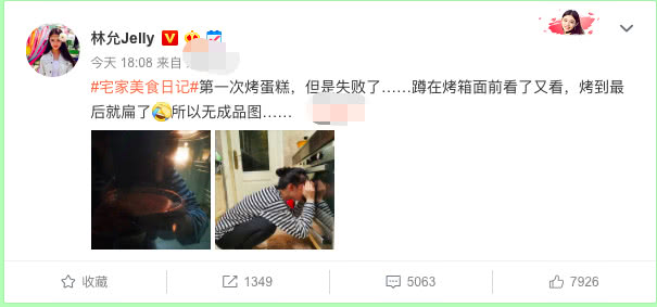 似乎是被上一次的红烧肉激励到,近日的林允爱上了下厨。2月20日,林允又在个人社交账号上和网友分享了自己做蛋糕的经历。不过可惜这次从家常菜到烘培的跨界失败了。林允懊恼地发文称:“第一次烤蛋糕,但是失败了……蹲在烤箱面前看了又看,烤到最后就扁了所以无成品www.ku2000.com图……”还晒出了自己蹲在烤箱前看蛋糕烘烤过程的滑稽照片,非常呆萌。