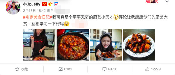 2月18日,林允通过社交网站分享了自己亲手制作的红烧肉,色泽鲜艳,肥瘦相宜,令人胃口大开。林允也是非常不自谦地表示:“我可真是个平平无奇的厨艺小天才!”非常可爱。