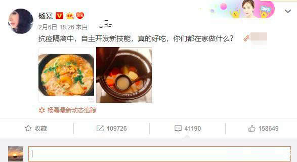最近这段时间,大家都启动了足不出户模式宅在家里。神通广大的网友们通过通讯软件发起了各种云聚会活动,自得其乐非常搞笑。在这段日子里,不少“失业”的明星艺人也难得留出了一段空闲时光,他们也是各尽所能,纷纷在网络上和网友分享自己的各种拿手绝活。最近不少明星在网上晒出了自己亲手制作的美食,看来都是很会享受生活的人啊。