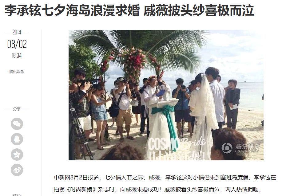 到2014年,两人突然开倍速发糖,6月初承认恋情,6月底戚薇说李承铉已见过父母,8月刚开了个头……